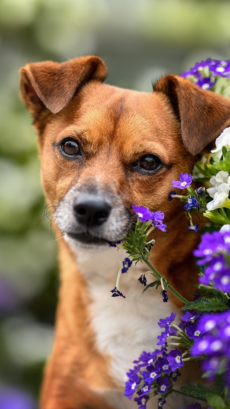 Edytor tapety: Biało-brązowy pies i kwiaty