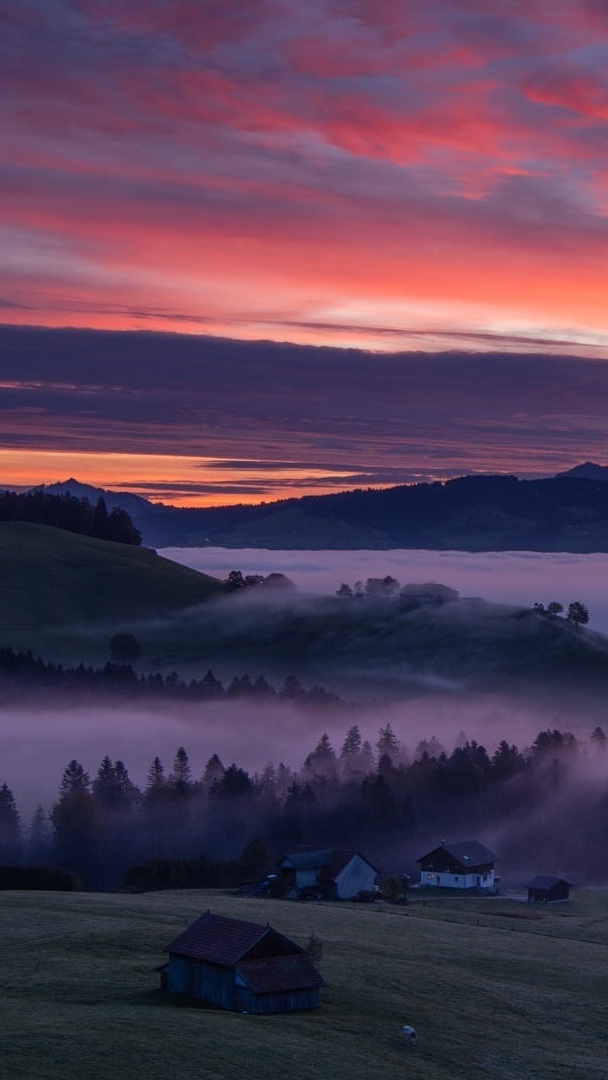 Edytor tapety: Gęsta mgła nad drzewami w dolinie