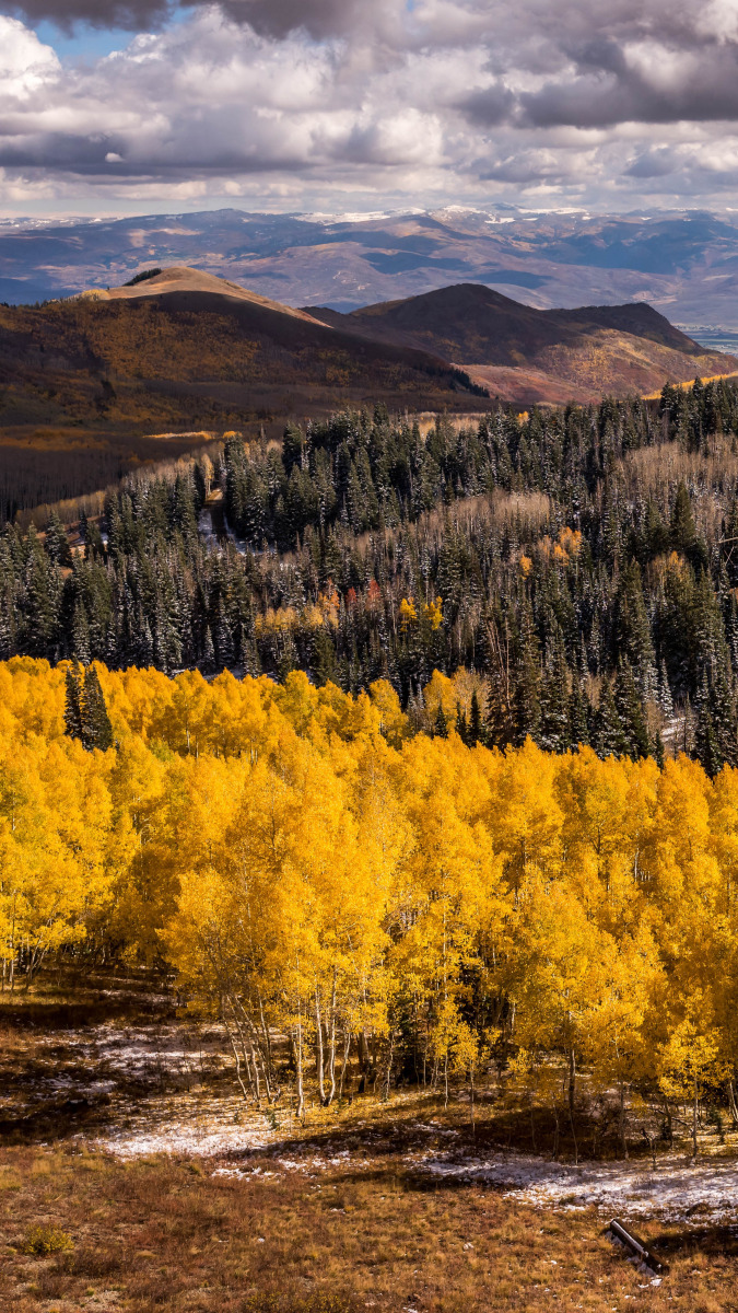 Edytor tapety: Rozświetlone pożółkłe drzewa na tle gór