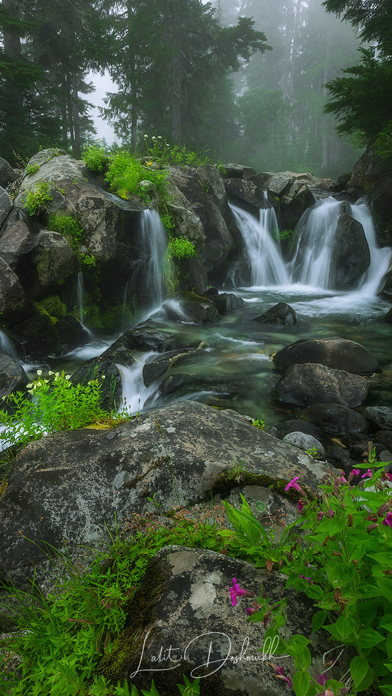 Edytor tapety: Rzeka na skałach w zamglonym lesie