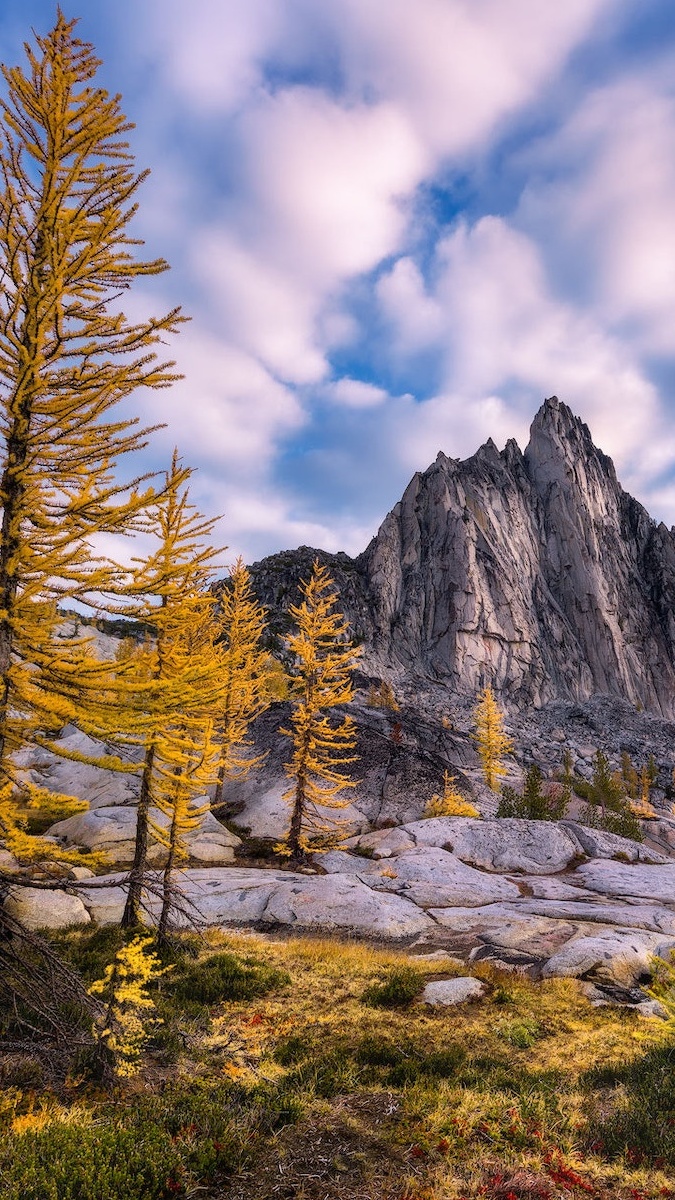 Edytor tapety: Modrzewie na skałach w górach