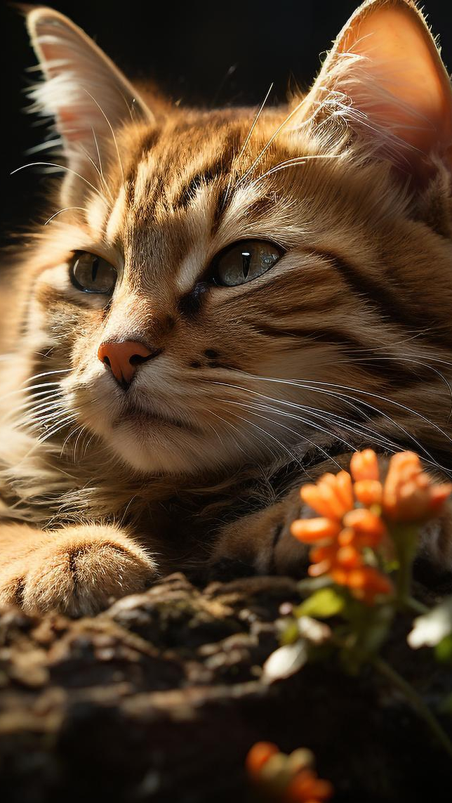 Edytor tapety: Kot leżący obok kwiatów