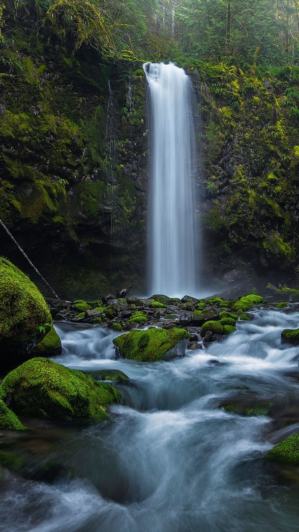 Edytor tapety: Omszałe skały przy leśnym wodospadzie