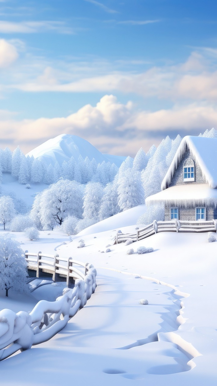 Edytor tapety: Ośnieżony domek i drzewa na wzgórzu