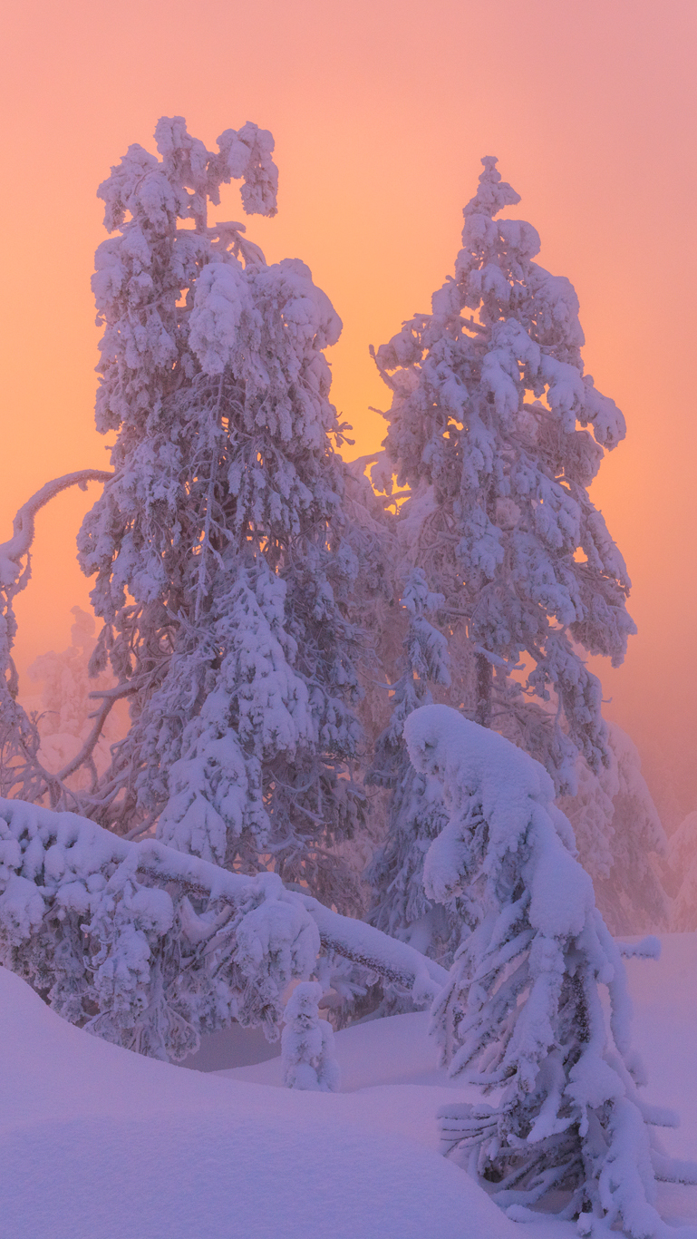 Edytor tapety: Zasypane śniegiem drzewa o poranku