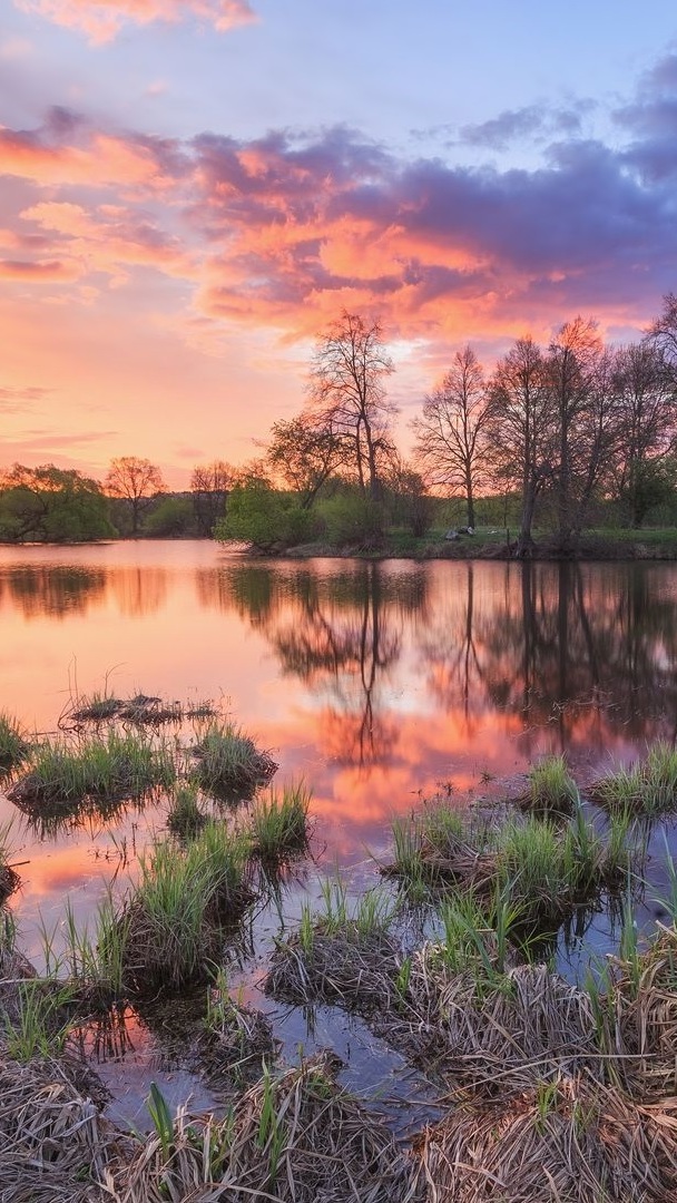 Edytor tapety: Kępki trawy i drzewa nad rzeką