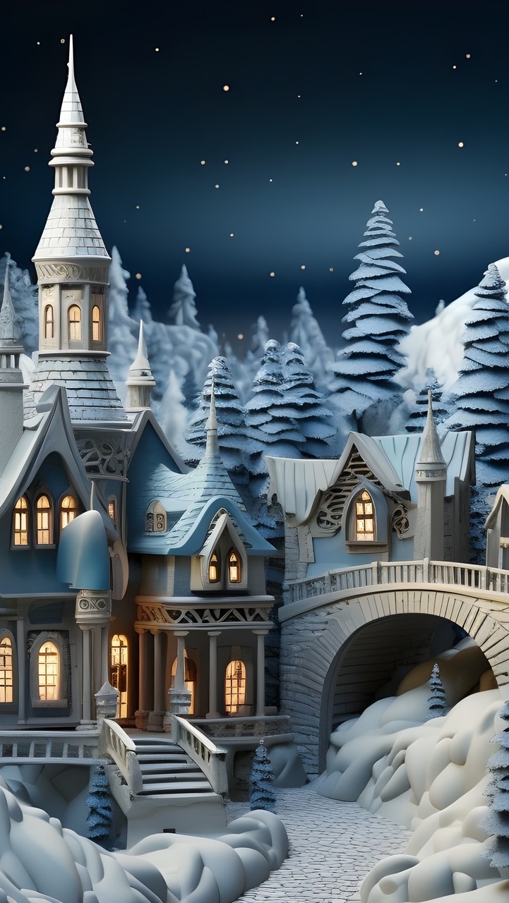 Edytor tapety: Bajkowy zamek na tle zimowych drzew