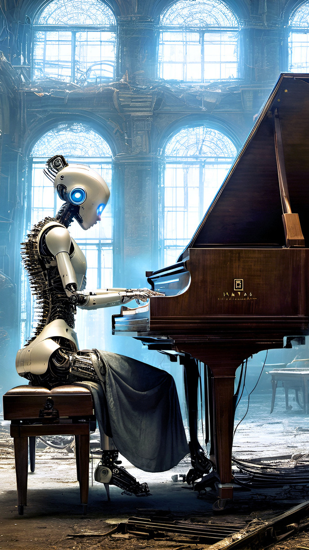 Edytor tapety: Kobieta robot grająca na fortepianie