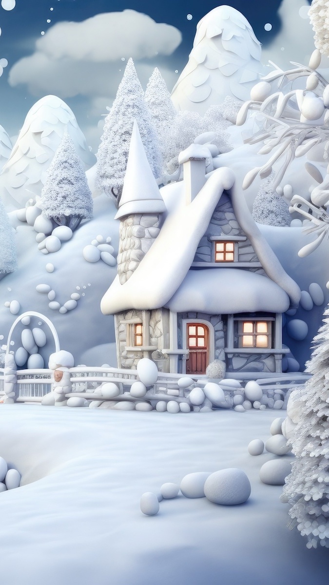 Edytor tapety: Ośnieżony dom i drzewa w grafice
