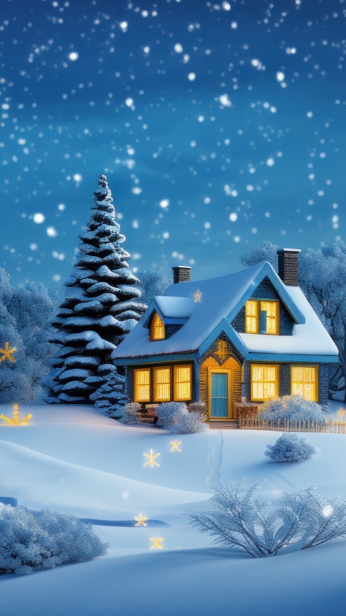 Edytor tapety: Oświetlony dom obok ośnieżonego drzewa