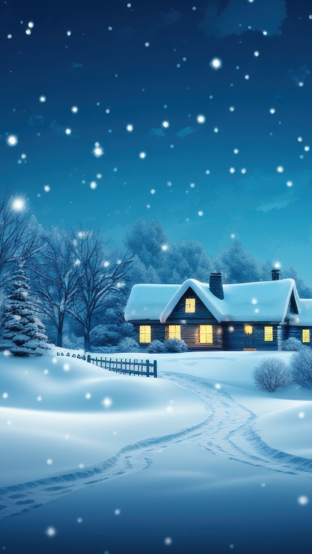 Edytor tapety: Oświetlony dom w padającym śniegu