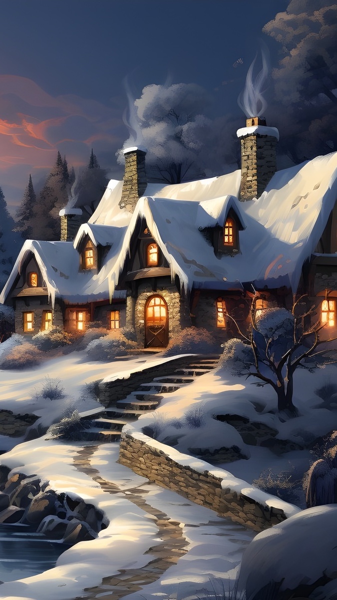 Edytor tapety: Zaśnieżony i oświetlony dom