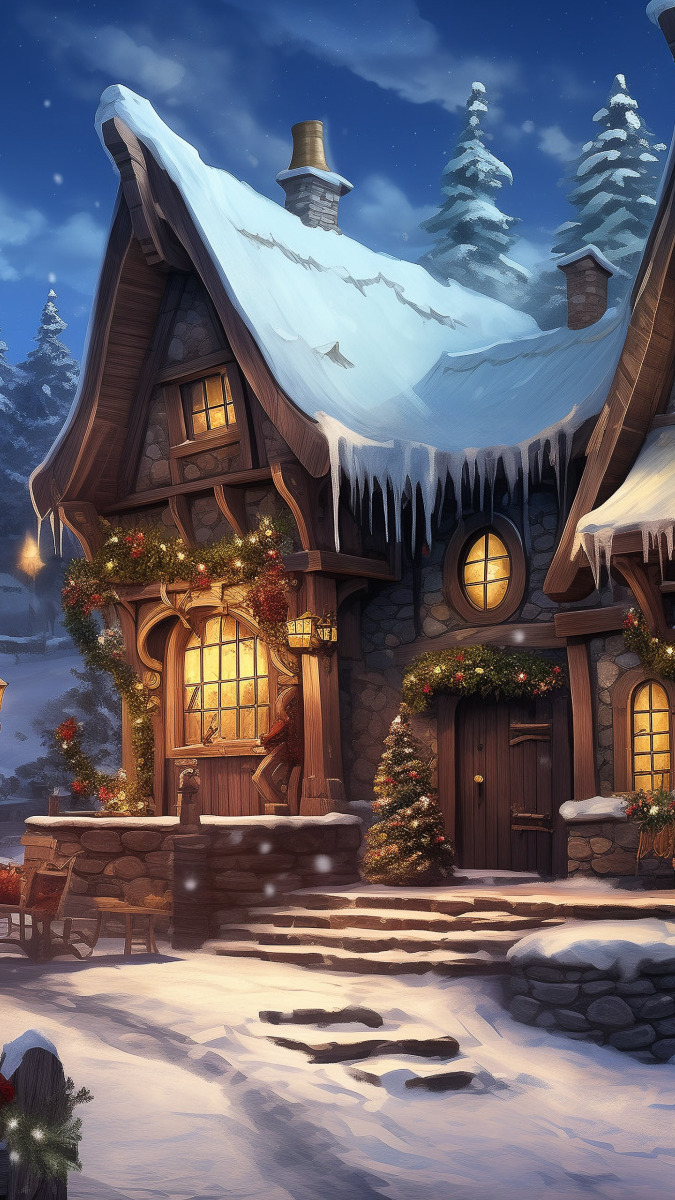 Edytor tapety: Oświetlony i ozdobiony świątecznie dom