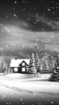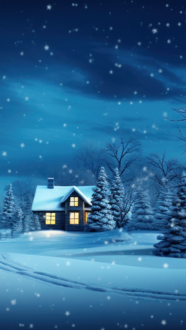 Edytor tapety: Oświetlony dom pośród ośnieżonych drzew