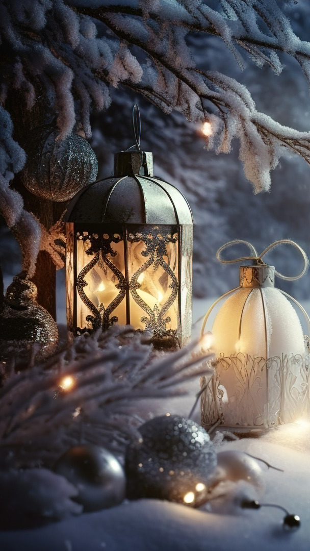 Edytor tapety: Lampiony i bombki pod ośnieżonym drzewem