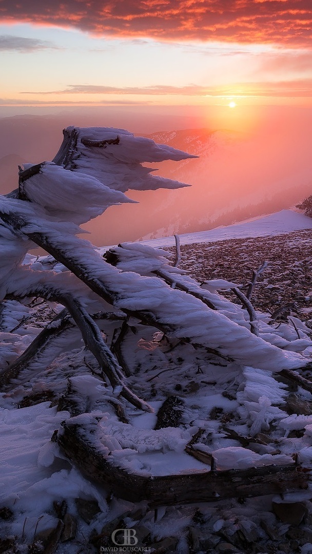 Edytor tapety: Ośnieżony pień drzewa o poranku