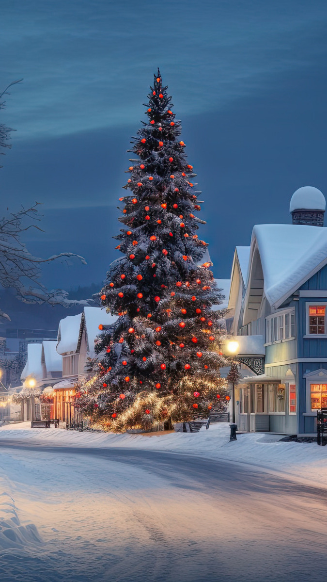 Edytor tapety: Udekorowana choinka na ulicy przed domami