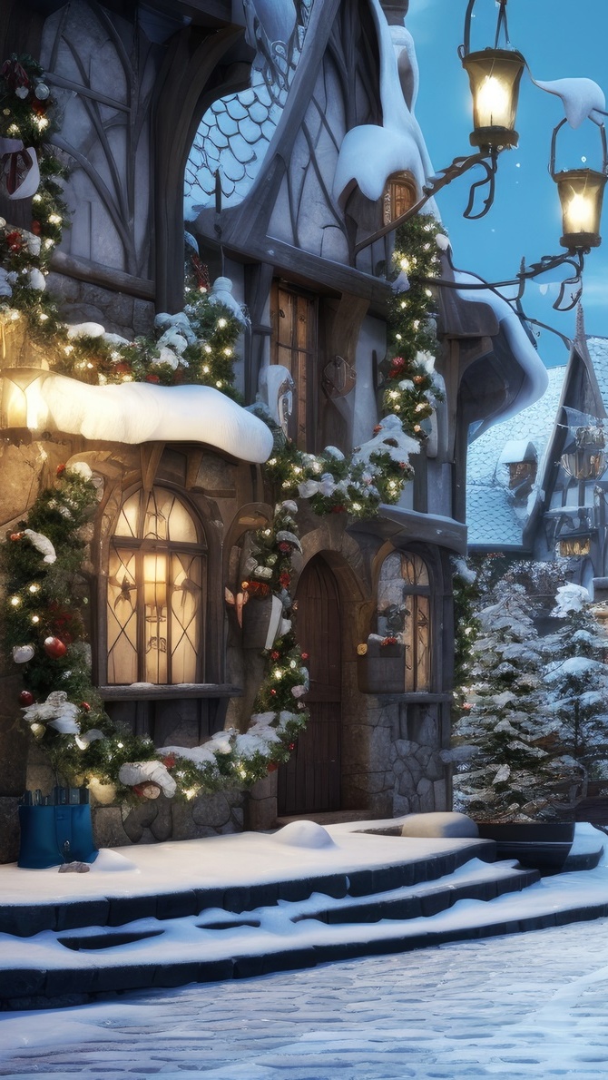 Edytor tapety: Oświetlone i udekorowane domy w miasteczku
