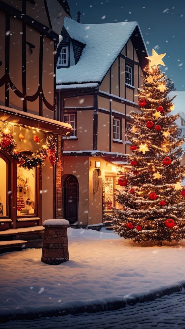 Edytor tapety: Świąteczna choinka na chodniku przed domem