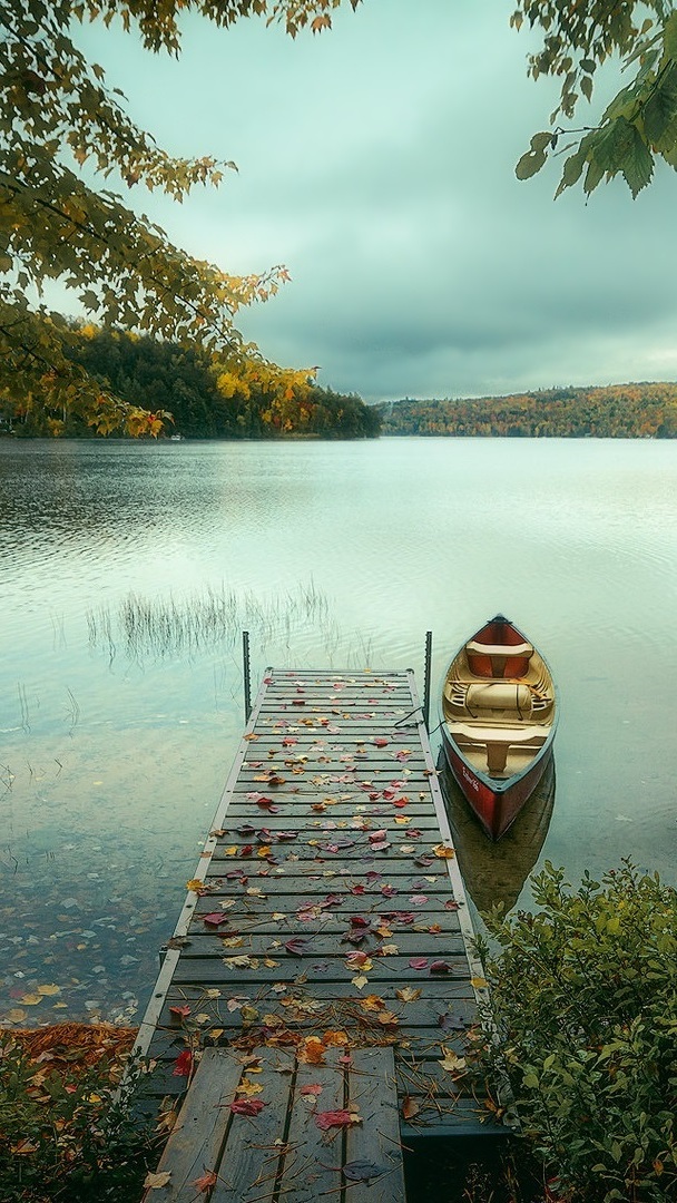 Edytor tapety: Łódka przy pomoście na jeziorze
