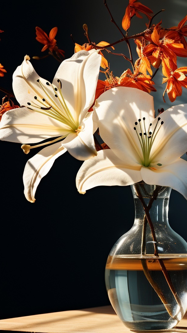 Edytor tapety: Rozświetlone białe lilie w wazonie
