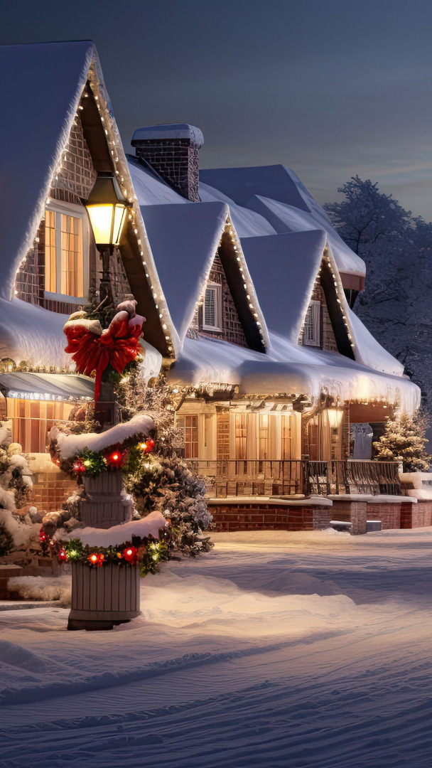 Edytor tapety: Udekorowana świątecznie latarnia przed domami