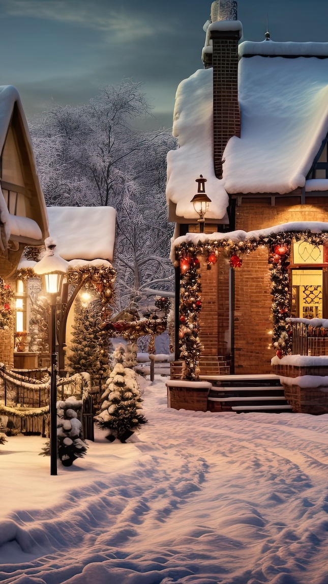 Edytor tapety: Udekorowane świątecznie domy przy zaśnieżonej drodze
