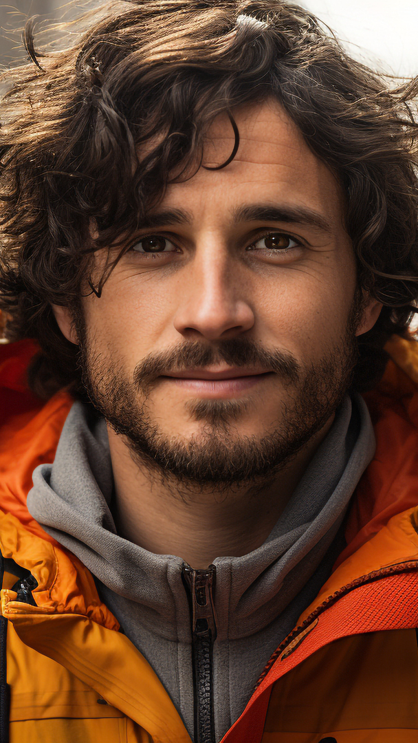 Edytor tapety: Mężczyzna z zarostem w pomarańczowej kurtce
