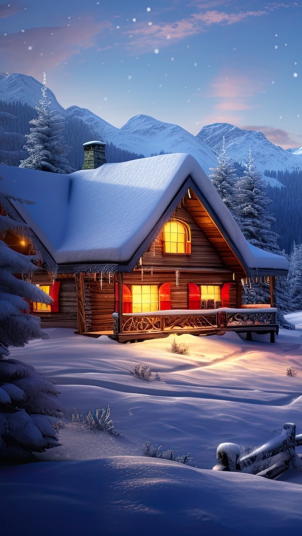 Edytor tapety: Oświetlona i ośnieżona drewniana chata