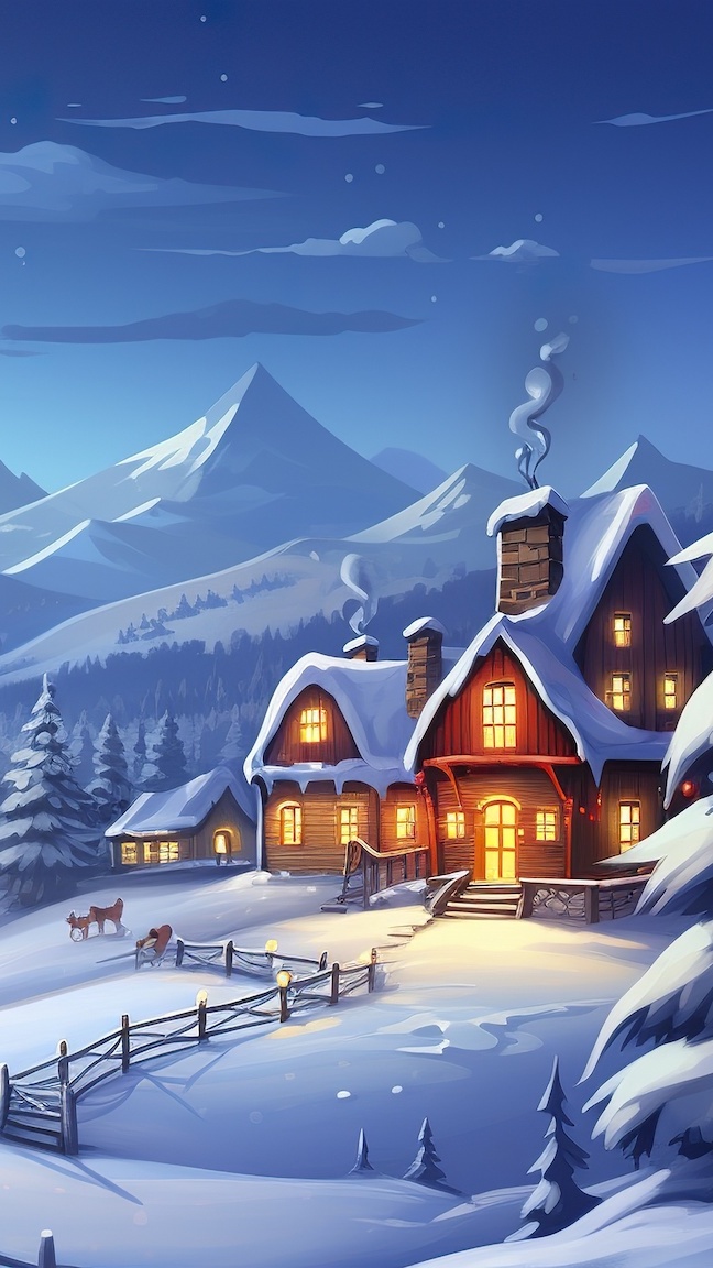 Edytor tapety: Oświetlone i ośnieżone domy w górach