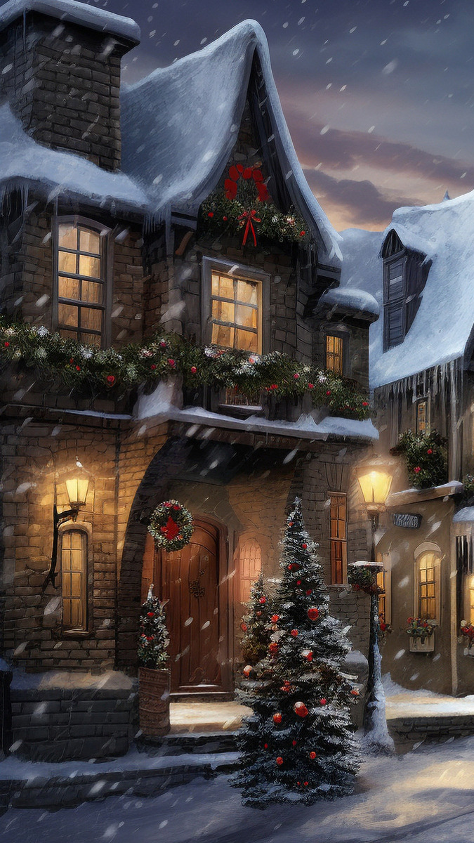 Edytor tapety: Choinka przed udekorowanym świątecznie domem