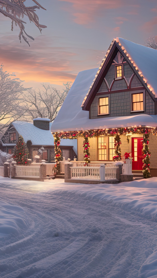 Edytor tapety: Udekorowany świątecznie dom przy zaśnieżonej drodze