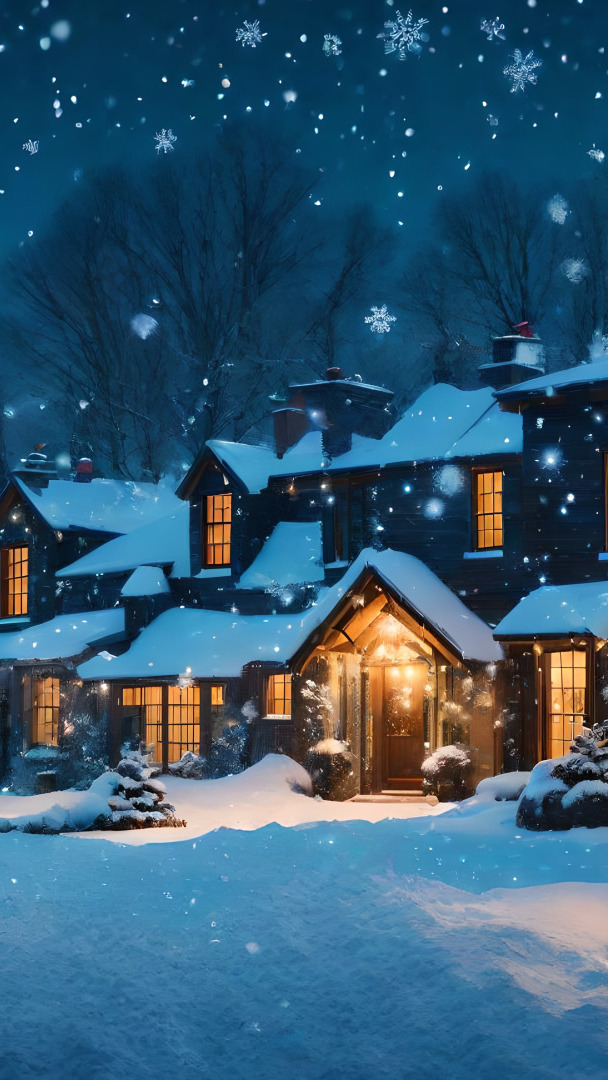 Edytor tapety: Oświetlone domy w padającym śniegu