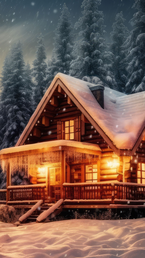 Edytor tapety: Oświetlony dom pod ośnieżonymi drzewami