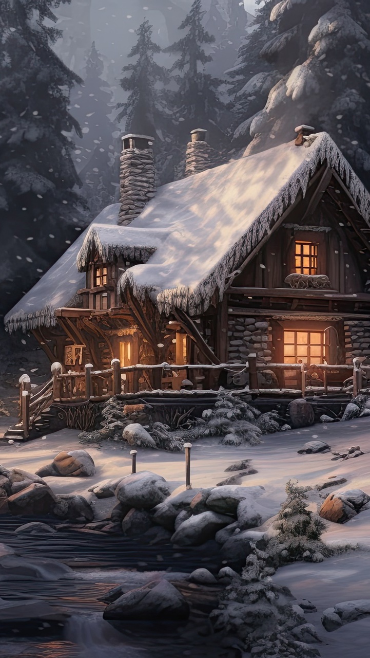 Edytor tapety: Ośnieżony dom pod lasem nad rzeką