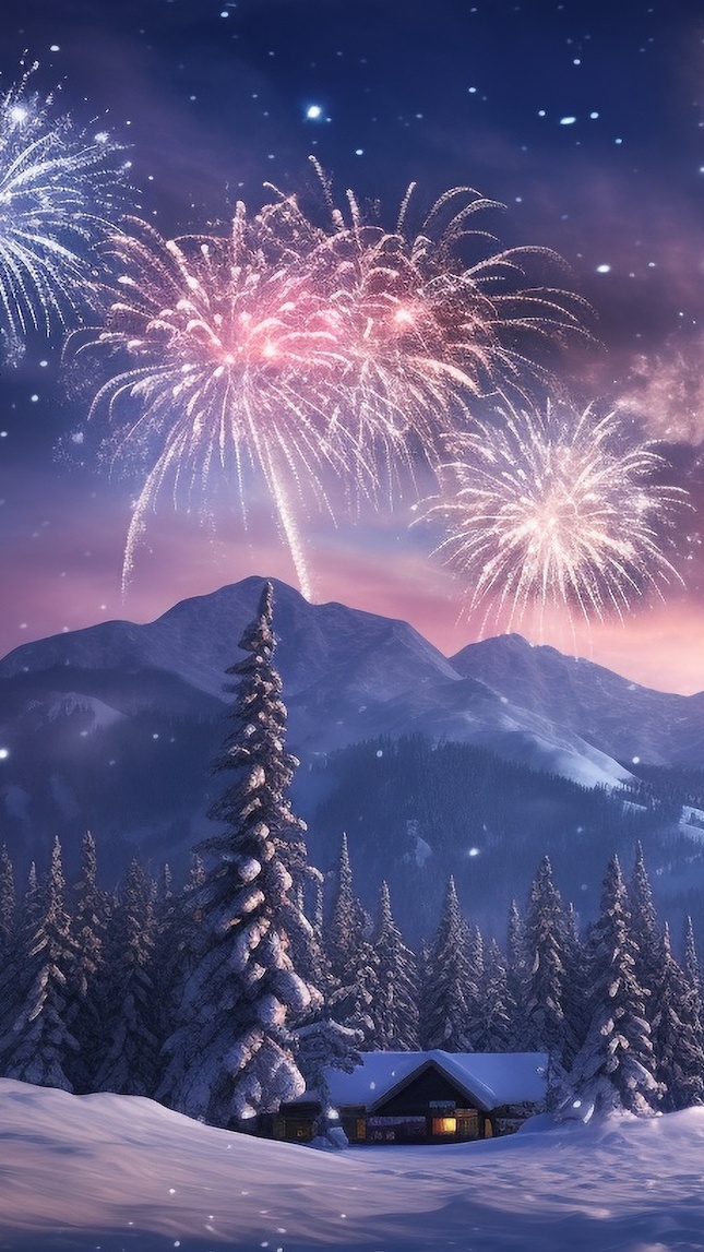 Edytor tapety: Fajerwerki nad górami i oświetlonym domem