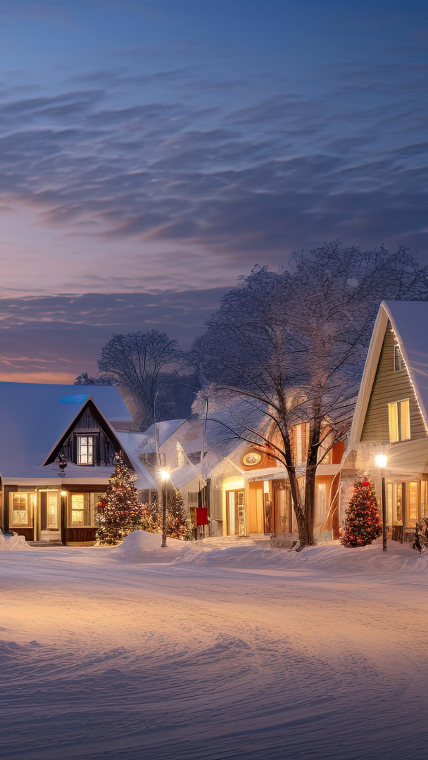 Edytor tapety: Oświetlone nocą domy przy zaśnieżonej ulicy