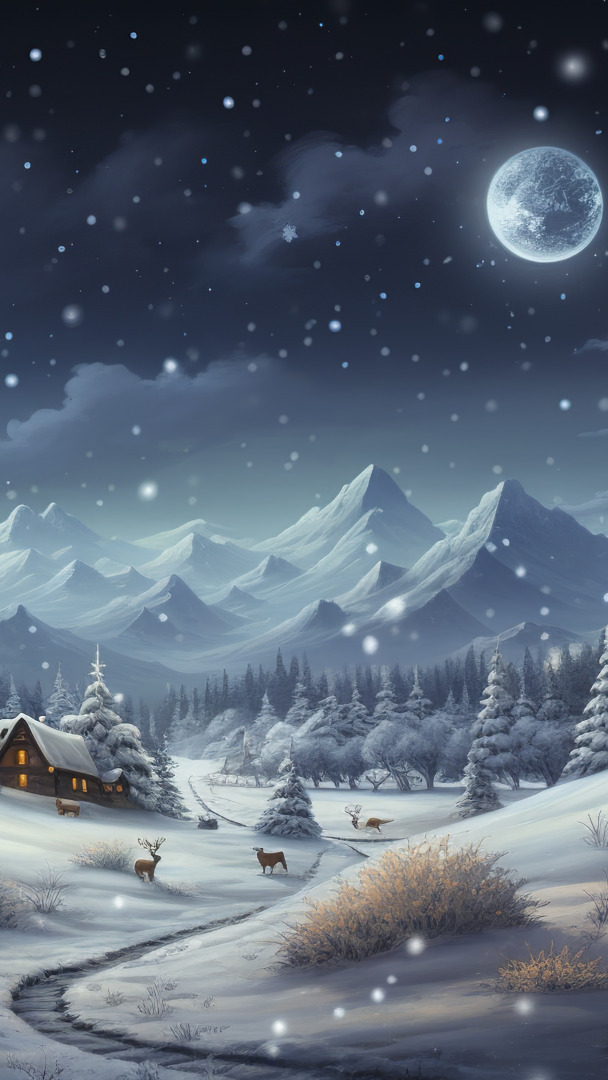 Edytor tapety: Księżyc nad górami i ośnieżonym domkiem