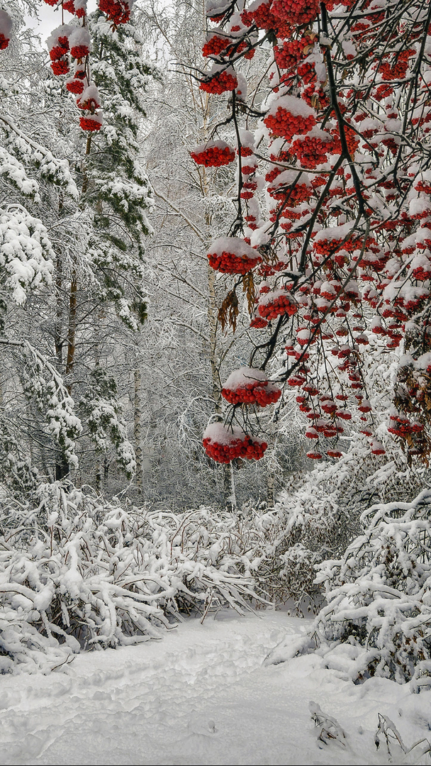 Edytor tapety: Ośnieżone owoce jarzębiny w zimowym lesie