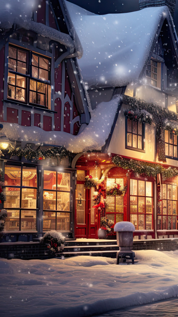 Edytor tapety: Ośnieżone dachy oświetlonych domów nocą