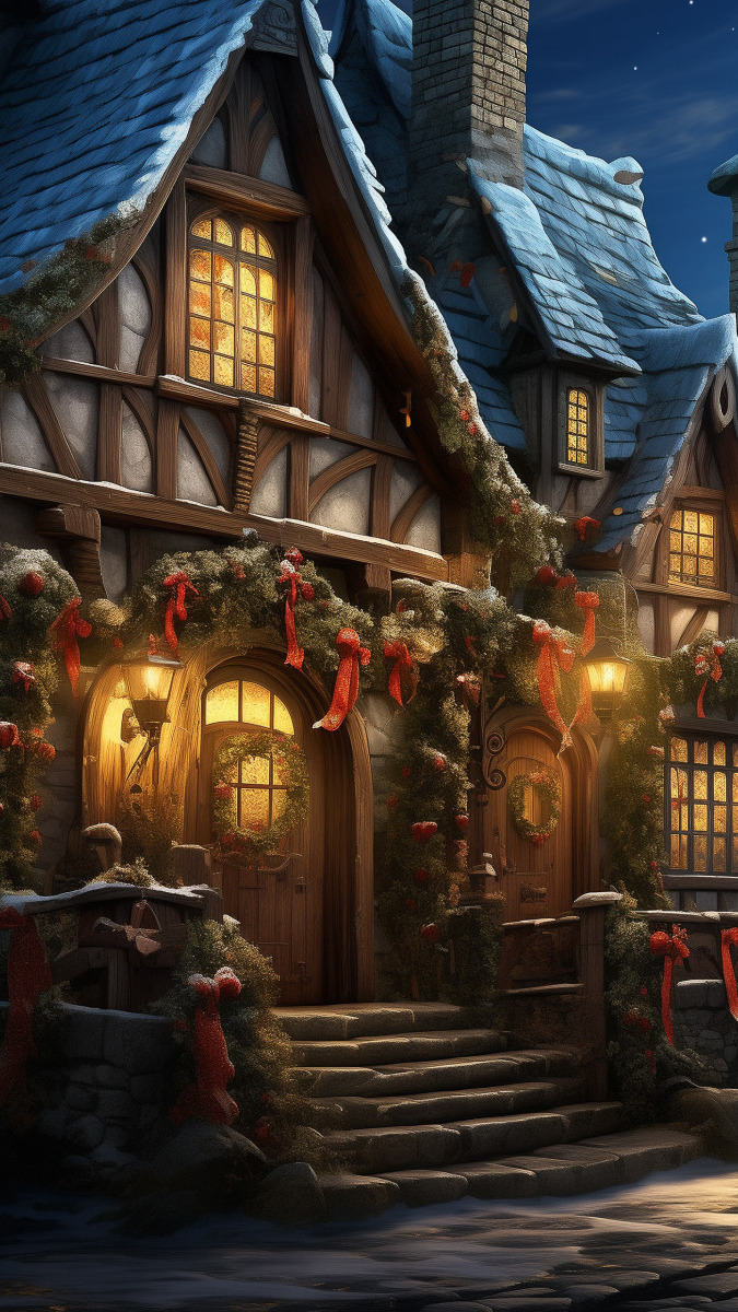 Edytor tapety: Oświetlony świątecznie udekorowany dom