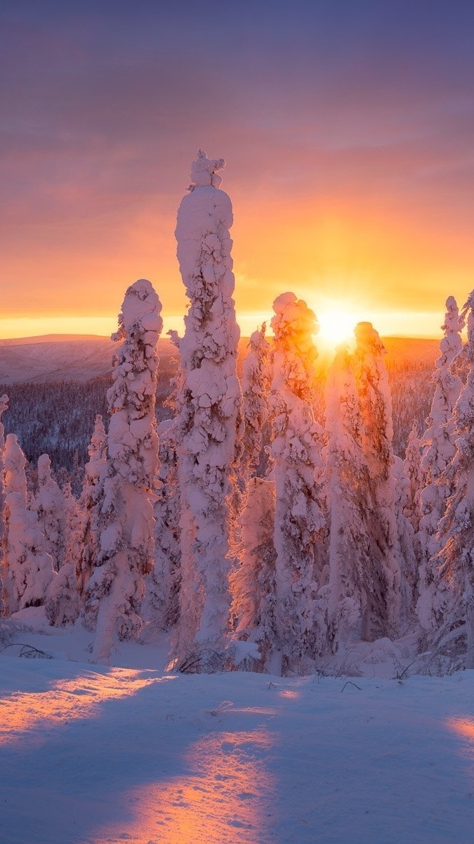 Edytor tapety: Ośnieżone drzewa w blasku zachodzącego słońca