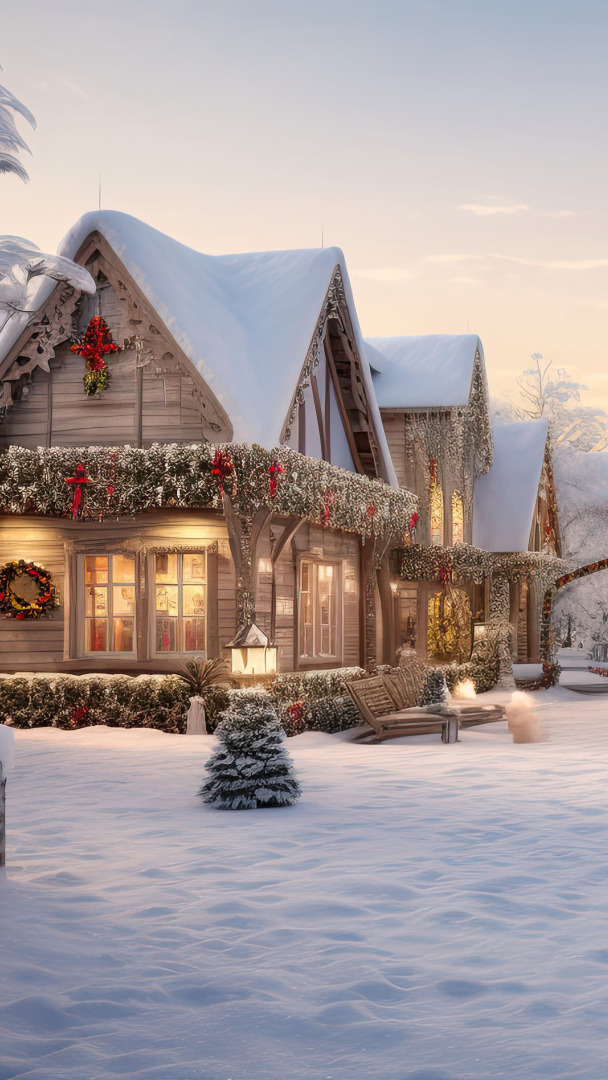 Edytor tapety: Udekorowane świątecznie ośnieżone domy