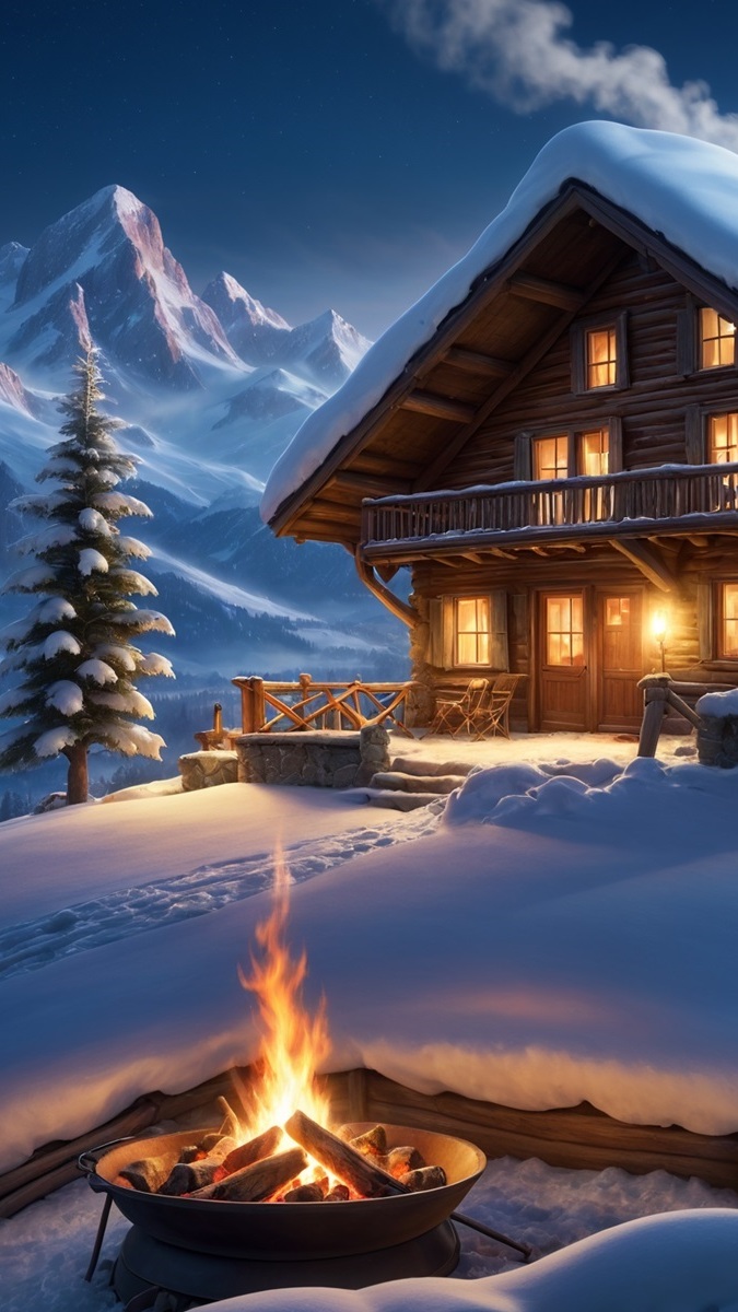 Edytor tapety: Ognisko na śniegu przed oświetlonym domem