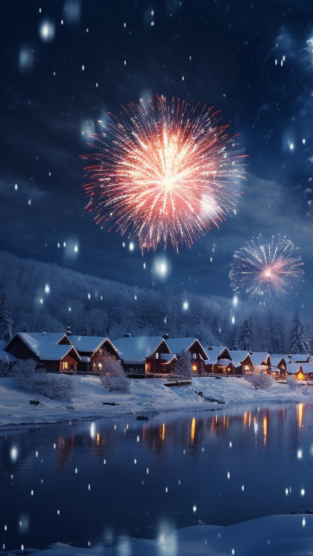 Edytor tapety: Fajerwerki nad wioską zimową porą