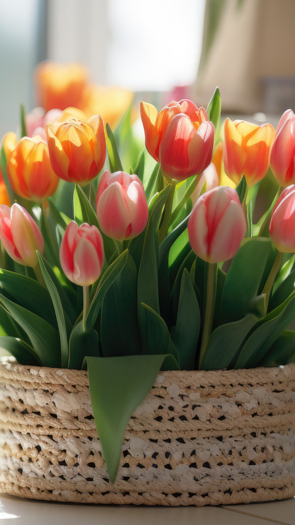 Edytor tapety: Tulipany w wiklinowym koszyku