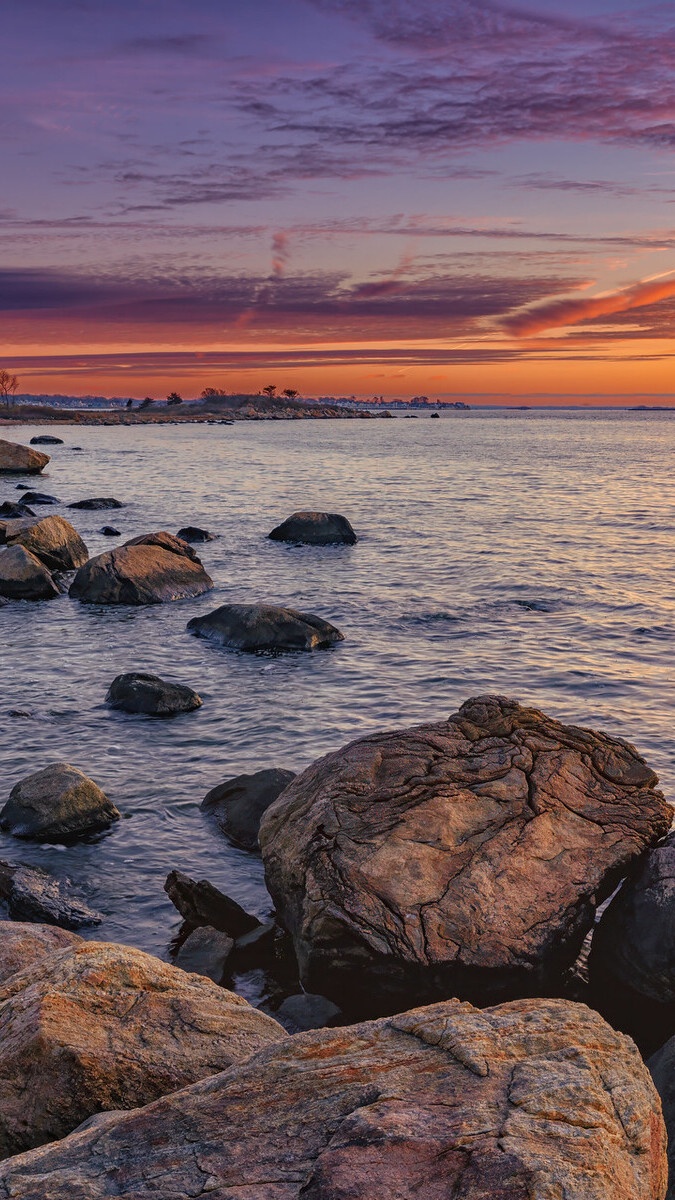Edytor tapety: Kamienisty brzeg morza o wschodzie słońca