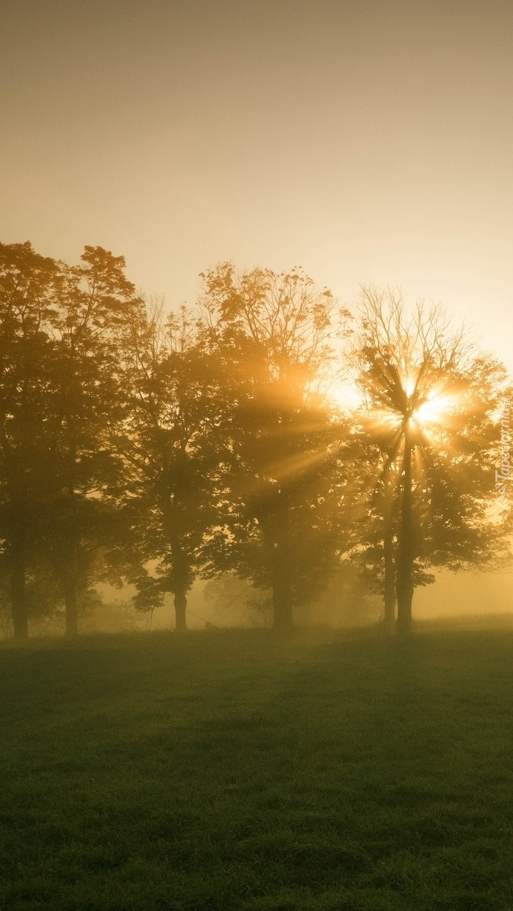 Edytor tapety: Zamglone drzewa o wschodzie słońca