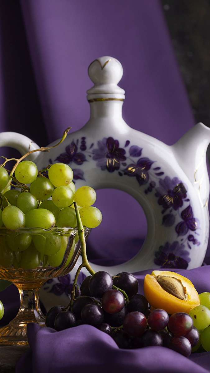 Edytor tapety: Kolorowe kiście winogron obok imbryka