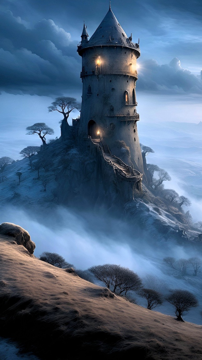 Edytor tapety: Wieża na zamglonej skale